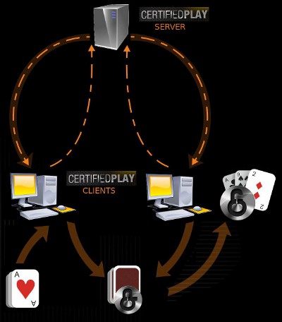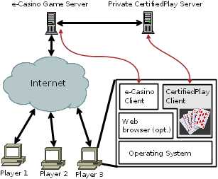 completely private. Gaming Infrastructure CertifiedPlay technology combines a state of the art MP protocol, with a complete and proven infrastructure for online game play, including an time-stamping service (to assure accurate times on messages), a broadcasting service (to forward messages to all other players), a logging service (to keep a log of all the game actions to allow ruling on a dispute), auditing entities (to rule on a dispute), network connection providers (like ISPs), online banks (to hold the bets and pay the pot), payment gateways (to transfer money from the player to the online bank), open-source client applications (to connect to the infrastructure), game servers (to direct the game with rules and actions) and game tracker servers (to search for an open table or create a new table to play in).
